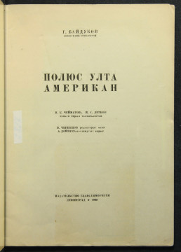| Наименование документа | Полюс улта американ = Через полюс в Америку / Г. Байдуков ; П. К. Чейметов, И. С. Летков маньси сирыл толмасьластэн ; В. Чернецов редакторыг олыс ; А. Дейнека послимутыт варыс. — Ленинград : Издательство Главсевморпути, 1939. — 44, [2] с.; 25x17,7x0,6 см.