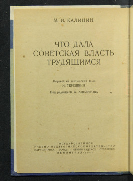 | Наименование документа | Что дала Советская власть трудящимся = Муй мас Советска власть трудящийсяита / М. И. Калинин ; перевел на хантыйский язык Н. Терешкин ; под редакцией А. Алелекова. — Ленинград : Учпедгиз, 1940. — 107, [2] с.; 17x12,5x1 см.