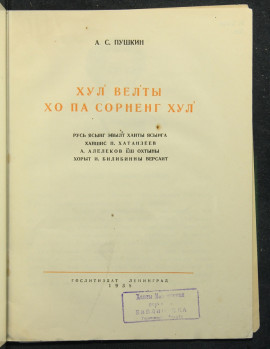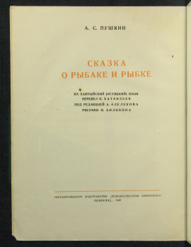 | Наименование документа | Сказка о рыбаке и рыбке = Хул велты хо па сорненг хул / А. С. Пушкин ; на хантыйский (остяцкий) язык перевел П. Хатанзеев ; под редакцией А. Алелекова ; художник И. Билибин. — Ленинград : Художественная литература, 1938. — 30, [1] с.; 22x16,5x0,3 см.