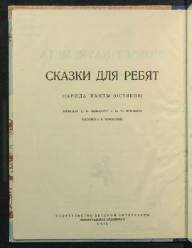 | Наименование документа | Сказки для ребят народа ханты (остяков) = Monset navremeta / записали: Д. В. Зальцберг и Н. ф. Прыткова ; рисунки А. К. Боровской. — Ленинград : Детская литература, 1935. — 28 с.; 21x16,5x0,4 см. (21x16,5x0,4 см).