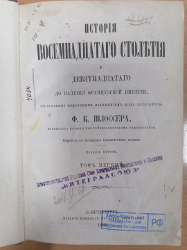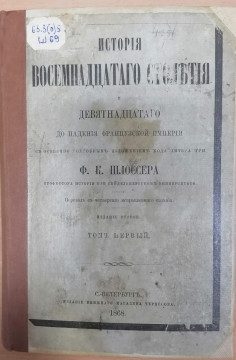 | Наименование документа | История восемнадцатого столетия и девятнадцатого до падения французской империи с особенно подробным изложением хода литературы : перевод с 4 исправленного издания : [в 8 томах] / Ф. К. Шлоссер, профессор истории при Гейдельбергском университете. - 2-е издание. - Санкт-Петербург : Издание книжного магазина Черкесова, 1868 - .