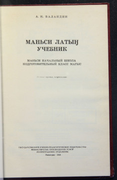 | Наименование документа | Учебник мансийского языка : для подготовительного класса мансийской начальной школы = Маньси латыӈ учебник : маньси начальный школа подготовительный класс магыс / А. Н. Баландин. - 3-е издание, исправленное. — Ленинград : Учпедгиз, Ленинградское отделение, 1958. — 82, [2] с.; 22,5 см. (22,5 x 15,0 x 1,0 см.).